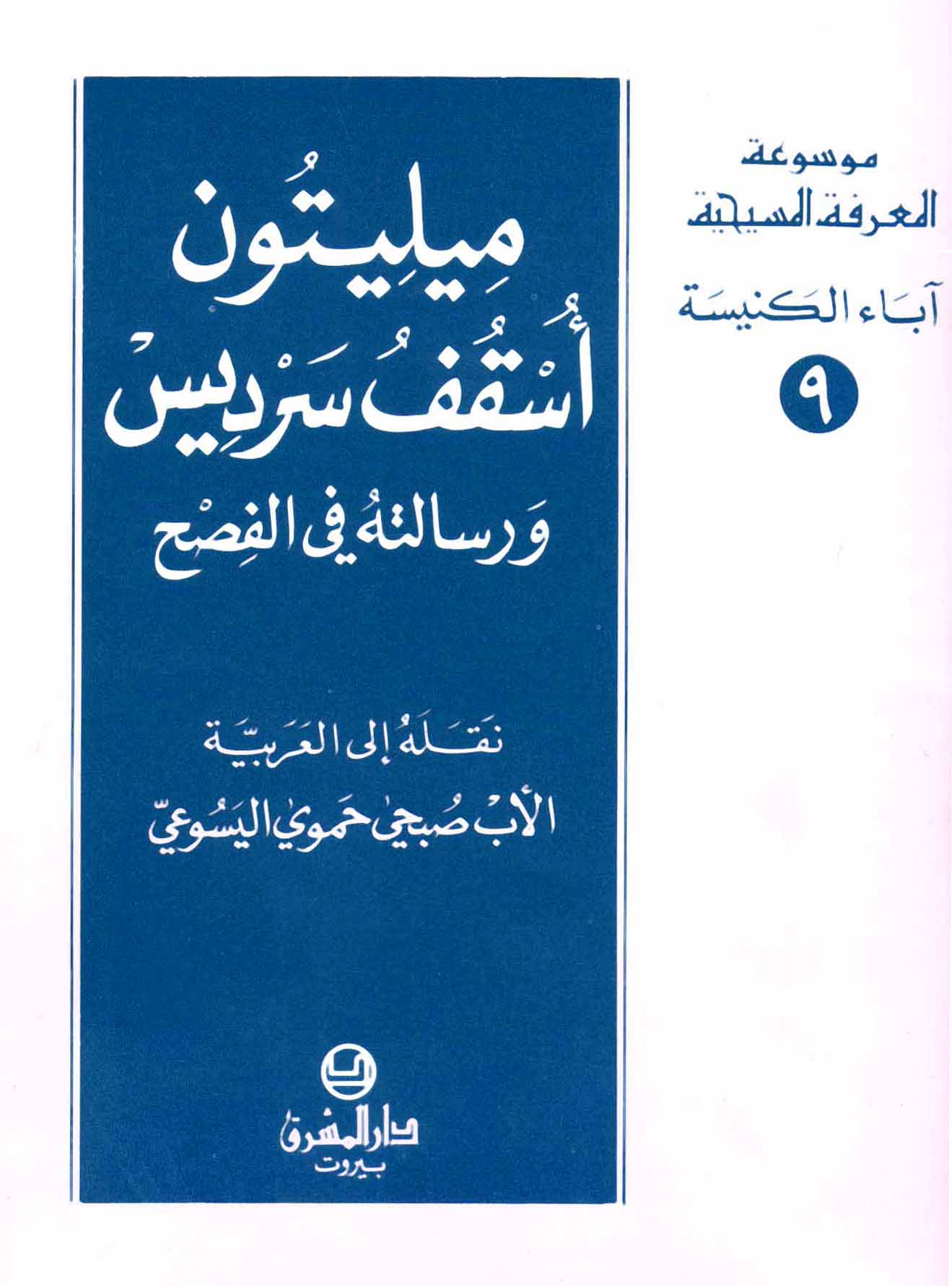 نجد في هذا الكُتيّب إجاباتٍ وافية عن التساؤلات التالية: من هو ميليتون أسقف سرديس؟ ما هي أهمّ مؤلّفاته؟ ما أهم عناصر الفنّ المثاليّ؟ وأهمّيّته في شرح الفصح اليهوديّ؟ كيف رفض إسرائيل الكافر بالنِعمة؟ أكانت رسالته في الفصح عظةً أم ابتهاجًا؟ كيف دعا الأمم إلى نيل غفران الخطايا؟